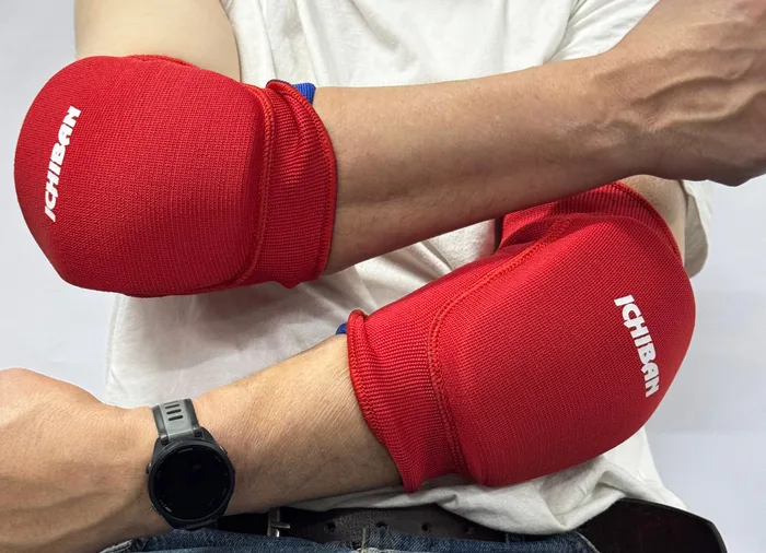 מגן מרפק שניתן להפוך והוא מחליף צבע בין כחול לאדום.